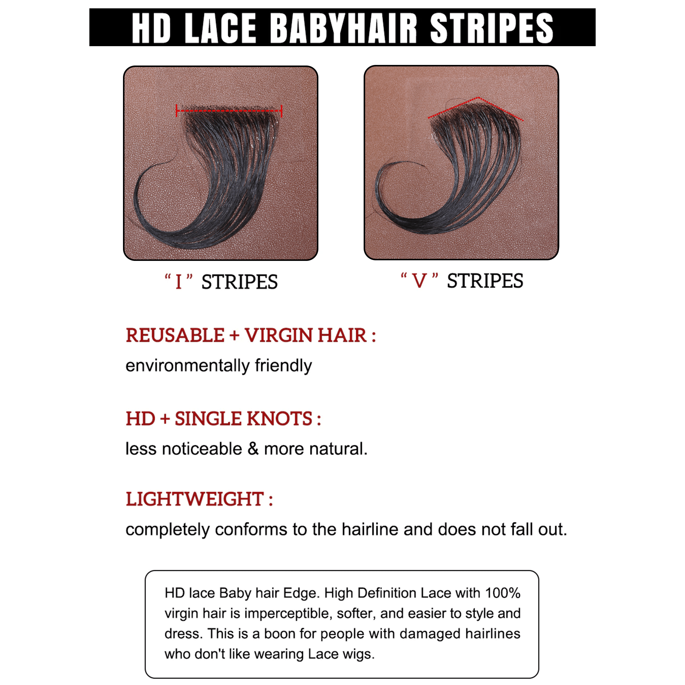 HD Lace Baby Strips, Suit for everybody who wants to style baby hair, they are reusable and the knots are super tiny, Top Swiss HD lace is very invisible. Best choice no matter you do ponytails or braids.